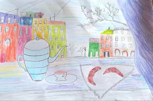 «Утро на Сретенке» На рисунке изображен уютный утренний вид из окна. Я хотела создать атмосферу спокойного утреннего завтрака на Сретенке. За окном видны яркие здания и деревья, придающие улице живописный вид. Рисунок передает тепло и уют утра в Москве. Техника выполнения: цветные карандаши.