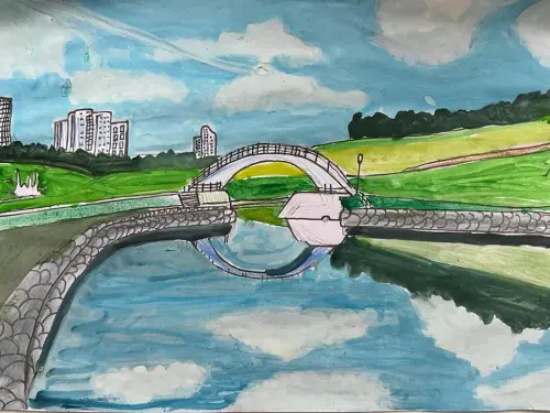 Я нарисовала мост в Парке Олимпийской деревни летом, потому что это красиво. Я люблю вырисовывать линии и раскрашивать свои рисунки.