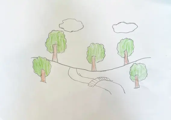 Моя работа выполнена цветными карандашами. Я люблю гулять по парку, поэтому и изобразила его на своем рисунке.Наш парк очень красив, особенно летом, потому что много зеленых деревьев и цветов.
