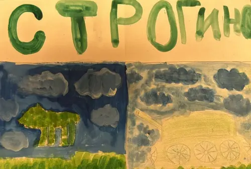 На своей картине я изобразила свои самые любимые места в районе Строгино. Зеленый мишка в сквере Кулакова и танк в парке рядом с пляжем — это те места, где мы часто гуляем всей семьей.