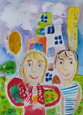 На рисунке изображён мой любимый двор, в котором я люблю гулять. Я нарисовала, как мы гуляем там с моим другом Сашей. Однажды в нашем дворе был праздник, и мне там подарили воздушный шарик.