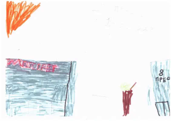 Слева можно увидеть часть здания с надписью «Моссовет», выделенную красным цветом, что подчеркивает важность этого места. Справа находится здание с надписью «Прео8». Перед зданием находится дерево, что добавляет рисунку живость. В верхнем левом углу изображен оранжевый треугольник, возможно, символизирующий солнечный свет или элемент архитектуры. Этот рисунок отражает характерные черты и атмосферу моего района.
