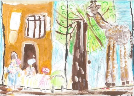 Первое семейное посещение Московского зоопарка летом 2024 года. На рисунке изображены: Алёна, маленькая сестра Нина, мама, папа, жираф Самсон и его дом.