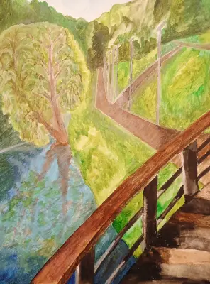 На моей работе нарисован пруд в Митинском лесопарке. Он находится около моего дома, и мы с семьёй очень любим гулять около него. Обычно, там много людей, но мы всегда можем найти тихое место, чтобы отдохнуть и побыть наедине с природой.