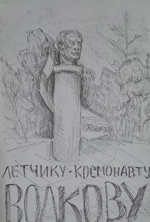 На моём рисунке изображён памятник, посвящённый космонавту Волкову, он находится недалеко от моего дома, я часто прохожу около него, когда иду к метро.