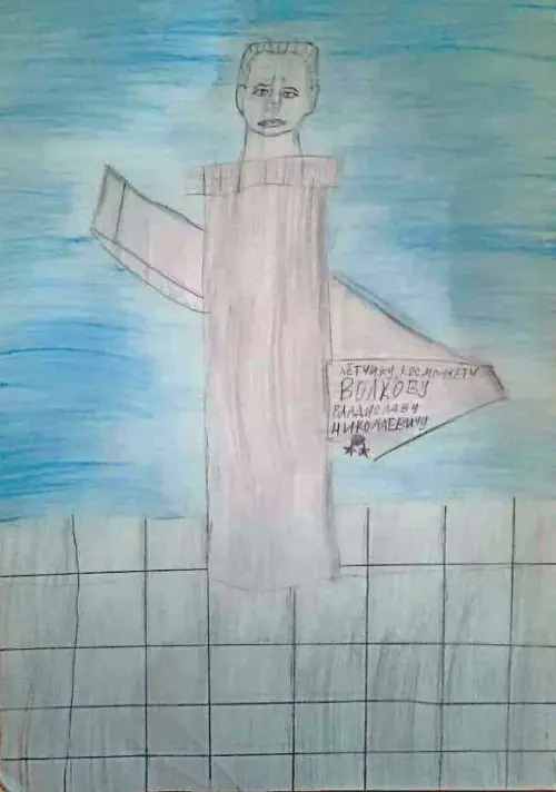 На рисунке памятник Владиславу Волкову — массивный бюст установленный в сквере Космонавта Волкова в Войковском районе г. Москвы в 1975 г.