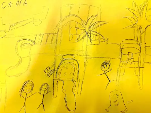 В моем дворе большая и хорошая детская площадка. Там есть детский интересный городок с тремя пальмами. Есть три горки, лазалки для малышей, на верху горок домик.