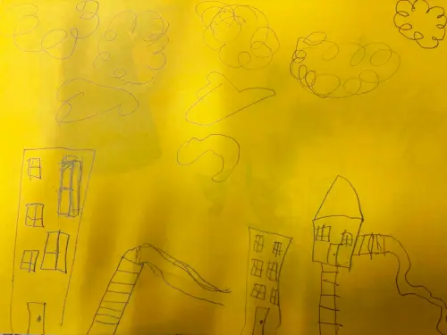 Я представил, как будет выглядеть мой двор через много-много лет… Это будут «летающие домики», в них будут играть дети и подниматься выше облаков! А чтобы не было страшно, можно будет спуститься по волшебной лестнице прямо к маме.