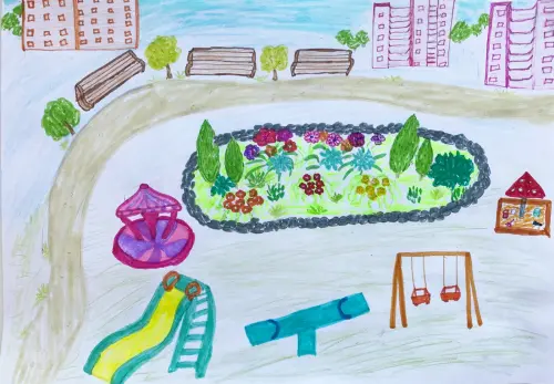Я нарисовала двор ярким, цветным, так как сейчас лето, и краски природы особенно красиво заиграли. Природа дарит нам теплые солнечные дни, и я много времени провожу на улице со своими друзьями.