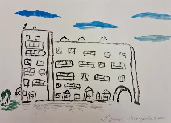 На рисунке изображён мой дом, он с пристройкой. Хорошая облачная погода, котик на верхнем этаже смотрит в окошко во двор и наблюдает за птичками. Под окнами моего дома растёт берёза.