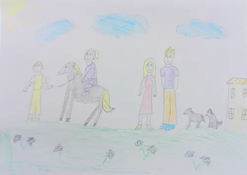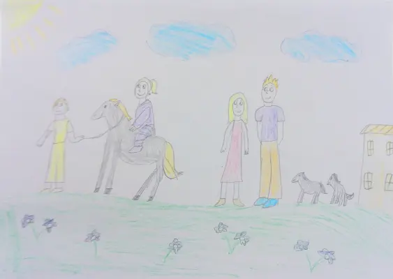 Я решила изобразить на рисунке недавно произошедшее со мной событие. Я вместе со своими родителями вышла погулять в парк и там встретила красивую лошадку. Я очень хотела почувствовать себя настоящей принцессой, поэтому мама и папа разрешили мне покататься на лошадке