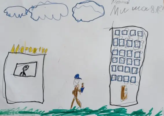 Я проживаю в районе Новокосино города Москвы. Наш район красивый, в нем много многоквартирных домов, детских и спортивных площадок. На рисунке изображен мой дом.