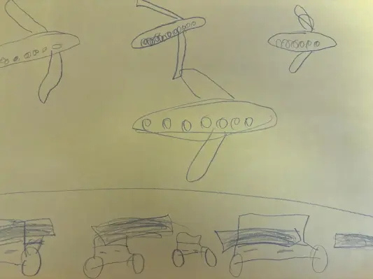 Анастасия нарисовала улицу своего района, она увидела как по дороге едут много машин, а в небе летят самолеты. Анастасия рассказала, что летала на самолете один раз с мамой и папой.