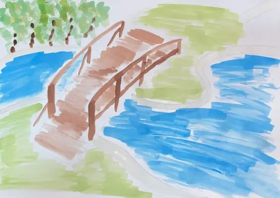 Мы с сестрой решили понять, кто из нас лучше нарисует мост в нашем любимом Парке «Дубки». Вот так я смог изобразить деревянный пешеходный мостик, по которому мы ходим каждый день.