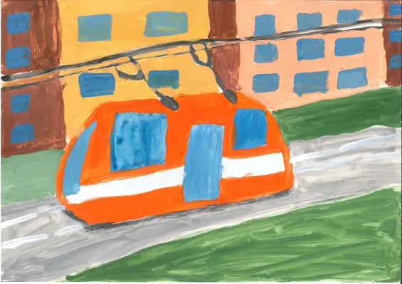 Мой рисунок выполнен в технике гуаши на бумаге. Он изображает трамвай, который едет по улице в летний день. На картине яркие и насыщенные цвета, которые передают атмосферу летнего города.