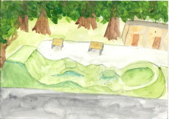 На рисунке фломастерами изображена скейт-площадка в парке Яуза по адресу Широкая 30. В центре композиции находится рампа для выполнения трюков, вокруг которой расположены различные фигуры и препятствия. На заднем плане видны деревья и зелёные газоны.
