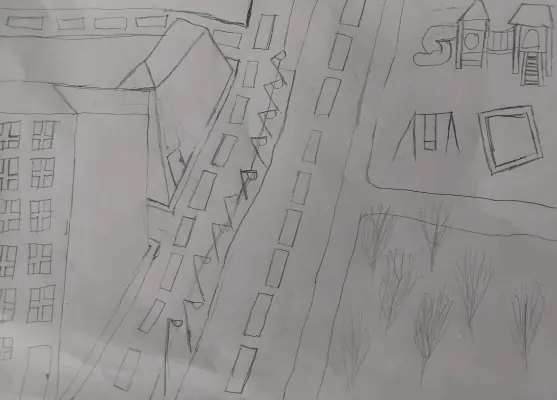 На рисунке я представила мой замечательный район со множеством возможностей и удобствами: новые и большие детские площадки, клумбы с цветами и много растений с деревьями, а также все необходимые магазины рядом с домом.