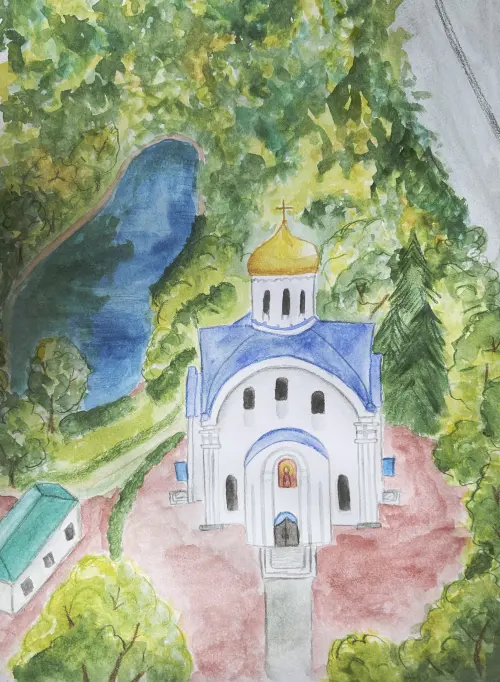 Работа нарисована акварелью и цветными карандашами. На рисунке изображен Храм Евфросинии Московской. Храм преподобной Евфросинии, великой княгини Московской, расположен в районе Котловка. Он был построен в период с 2006 по 2012 год по проекту архитектора Владимира Ивановича Козлова. Чин великого освящения храма состоялся 2 июля 2017 года, его провёл Святейший Патриарх Кирилл.