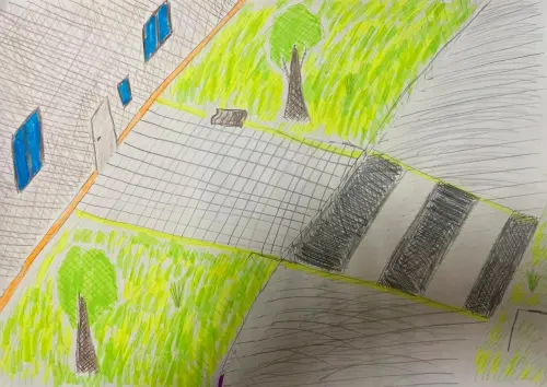 Я нарисовал как я иду в школу, перехожу автомобильную дорогу через пешеходный переход. Родители меня учили смотреть направо и налево, чтобы не было машин и со мной ничего не случилось. Дорога в школу мне нравится.