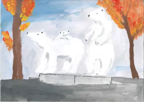 Мой рисунок выполнен гуашью. В сквере недалеко от моего дома есть большая скульптура, изображающая семью белых медведей. Особенно красиво она выглядит, когда вокруг будут яркие осенние листья.