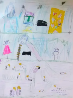 В моем дворе очень много детских площадок, но есть у меня самая любимая, она большая и на ней очень интересно играть. Её я и нарисовала. Я люблю проводить на ней время.