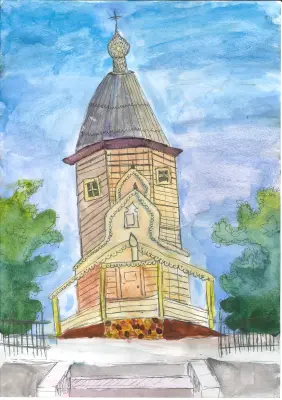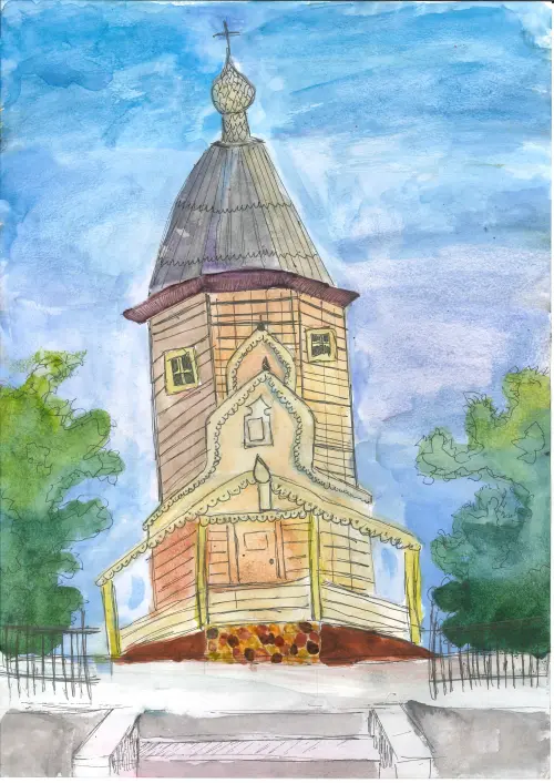 Мой рисунок выполнен акварельными красками и дополнен контурами лайнера. Небольшой храм, изображенный на рисунке, построен из дерева и выглядит очень живописно среди городских бетонных улиц.