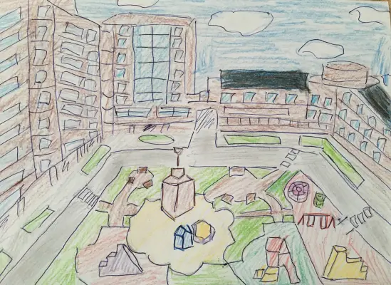 Мы проживаем на улице Щукинской, дом 2. У нас чистый и красивый двор. Высажены кустарники и цветы, имеется детская площадка. Мы часто играем с детьми на площадке, у нас живут дружные ребята.