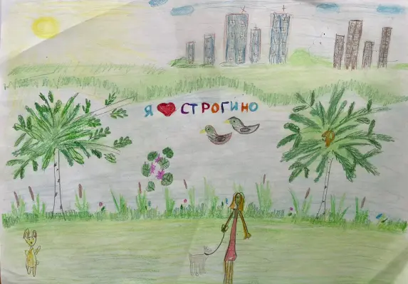 Мой любимый район — Строгино! Я с родителями часто гуляю по набережной Москвы-реки, там много разных деревьев, спортивных площадок, детских площадок, лавочек.