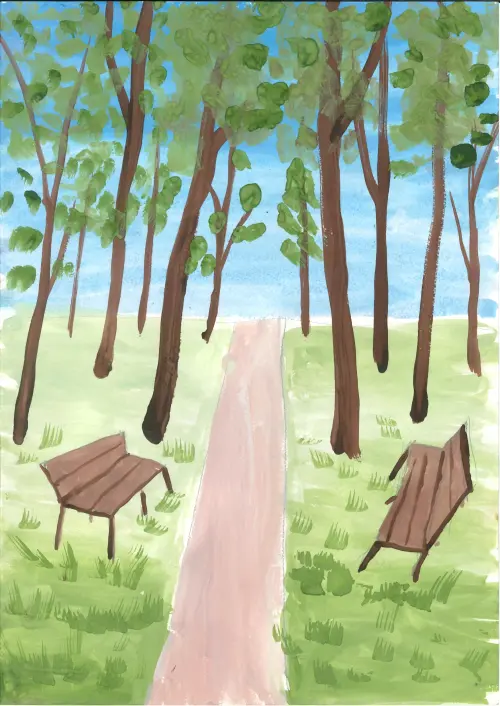 Моя работа, выполненная гуашью, изображает летний парк «Яуза». Мне очень нравится гулять с мамой и сестрой под большими деревьями, летом под ними так прохладно!