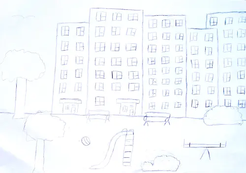 Я Виктория. Мне 12 лет. Я нарисовала двор своей мечты. Я бы хотела, чтобы так выглядела моя площадка. Я хочу, чтобы из-за моего рисунка поставили больше площадок.