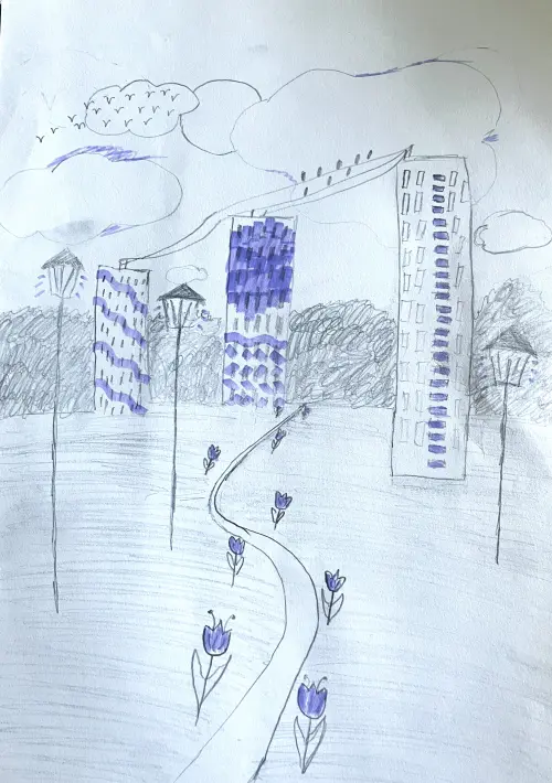 На рисунке изображен район Ново-Переделкино города Москвы с некоторыми фантазийными элементами. Это летний пейзаж. Я рисовала на улице поэтому рисунок выполнен простым карандашом и немного раскрашен сиреневым маркером.