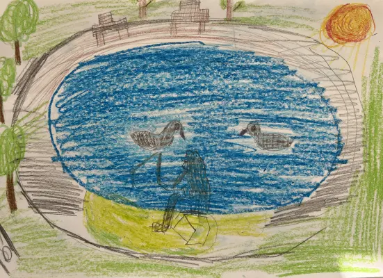 У нас во дворе есть маленький пруд, я люблю к нему приходить и запускать свой корабль на пульте управления, еще мне нравится на нем рыбачить, кормить уток и заниматься спортом на спортивной площадке. Я люблю свой район.