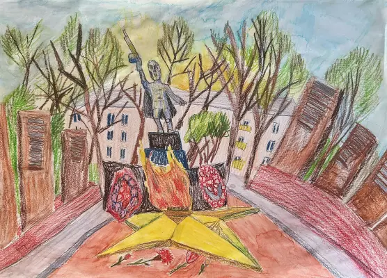 Я очень люблю аллею славы в нашем городе. На ней есть вечный огонь и памятник погибшим войнам Великой Отечественной войны. Каждый год на 9 мая мы ходим возлагать цветы. Свою работу я рисовал акварельными карандашами с частичным размытием водой.