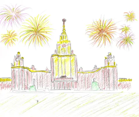 Меня зовут Василиса, мне 8 лет, и я учусь во втором классе. Мама и папа почти каждый день водят меня к МГУ. И, однажды, я увидела, как над ним прекрасно блестел салют. С этого дня моя мечта — учиться в таком красивом здании, где очень много умных людей!
