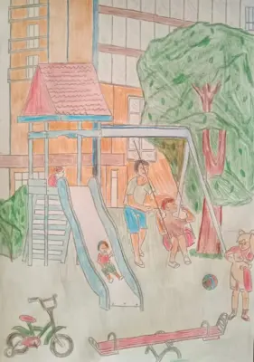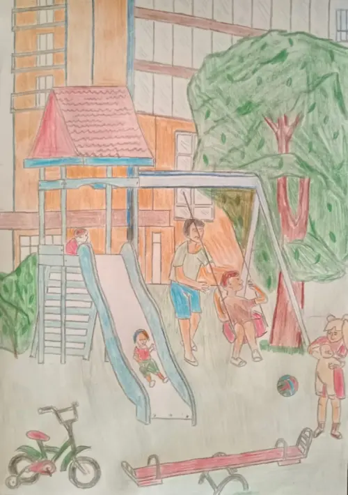 На рисунке я изобразил свой двор, где есть разнообразные качели, большая горка, место для игры в мяч.