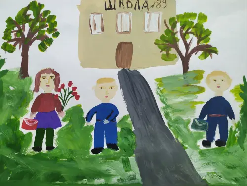 На моем рисунке нарисована школа имени А. П. Маресьева, советского военного лётчика-истребителя, Героя Советского Союза. Я пойду туда в первый класс вместе с мамой. Хочу найти там много новых друзей.