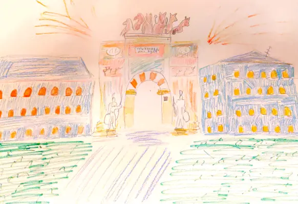 Добрый вечер, мой сын нарисовал место, какое его вдохновляет — это Триумфальная арка парка Победы. Он очень любит там гулять, любит танки и достопримечательности.