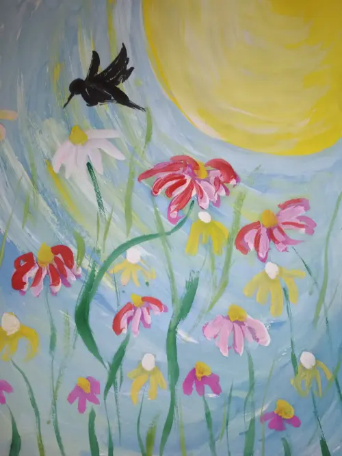 На закате можно подсмотреть необычные виды. Вот и здесь я изобразила птицу на фоне заходящего солнца. А кругом цветы, цветы. И такая звонкая тишина, что кажется, будто никого вокруг не существует.