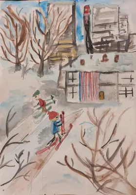 Есть в нашем городе и памятники и парки, и площади и торговые центры, но есть такое место — лыжная база «Лесная». Казалось бы база как база здание и только, но какой бы праздник не был там всегда что-нибудь происходит. Сюда можно прийти точно зная что будет не скучно. Тут есть велосипеды и мячи, стреляют из лука и лазят на скалодроме, тут можно выпить чаю или просто посидеть посмотреть как тренируются другие. Зимой лыжи и тюбинг, летом велосипед, весной текут ручьи и пускают кораблики. На моей картине зима, потому что это Лыжная база, но хороша она всегда и в любое время года.