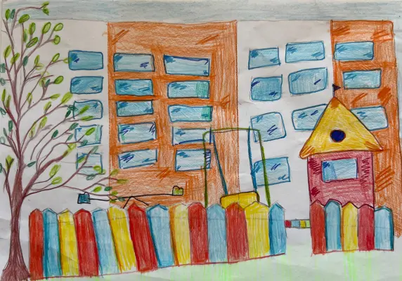 На рисунке я изобразила двор который находится рядом с моим домом. Он самый любимый и красивый. Тут я играю с самого моего рождения со своими друзьями и братом.