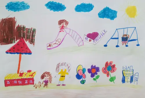 Я нарисовала любимый Троицк, детскую площадку, цветы, маму и себя.Я нарисовала любимый Троицк, детскую площадку, цветы. Я и мама гуляем с нашей собачкой- Левой. Дети катаются на горке и веселятся. Моя подружка качается на качелях.