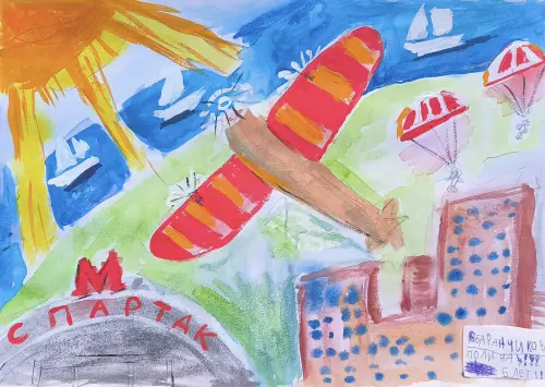 Мама много рассказывает нам об истории нашей улицы, района, округа. Почти на каждой прогулке мы слышим всё новые истории города, который раньше был в городе – Тушина. Поэтому я решила нарисовать главную достопримечательность – аэрополе, где сейчас стоит наш дом, а раньше стояли и летали самолёты, проходили авиапарады. И ещё реку, которая как дорога отделяет наш район от соседей. Мы живём рядом с метро Спартак, поэтому станцию метро я тоже нарисовала