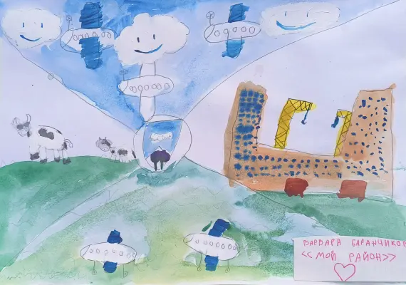 Я хорошо знаю историю нашего округа – здесь были и фабрики, и заводы, здесь собирали космический челнок Буран, проходили авиапарады, и потому на гербе района изображены крылья, символ авиации. А ещё фиалки, которые, как я думаю, символ того, что наш район очень зелёный. Мы с семьёй живём там, откуда ещё недавно взлетали самолёты, на тушинском аэродроме. Сейчас здесь строится жилье. На рисунке я изобразила прошлое и будущее аэродрома – слева прошлое, когда аэродрома не было, по центру – самолёты на авиаполе и в небесах, а справа, в настоящем и будущем – жилые дома, которые строятся здесь. Я люблю свой район, и облакам на моем рисунке он тоже очень нравится, поэтому они улыбаются.