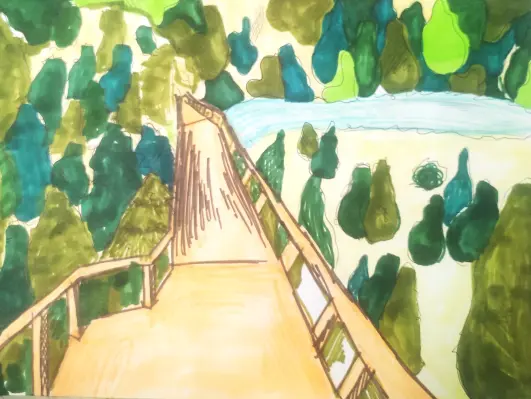 В данной работе изображён вид на обновленный парк Шмелевский ручей. Автор рисунка стоит в самом начале мостика и видит перед собой часть парка, утопающего в зелени. По этому мостику, как и по жизни, она пойдет в новый, красивый, современный парк, со множеством интересных локаций: детских и спортивных площадок, зоны отдыха с лежаками и прудиком, от которого веет прохладой и умиротворением, лесочек, с мангалтными зонами и зонами для пикников.