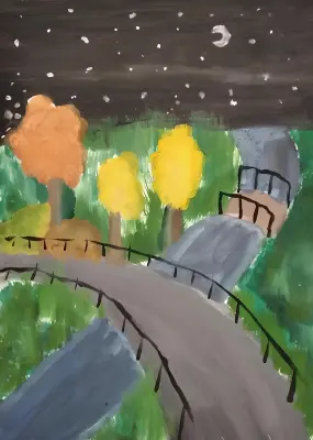 На рисунке изображены мосты в осеннем парке ночью. Под ними течет река, её поверхность отражает свет звёзд и луны, создавая атмосферу волшебства. Деревья покрыты золотистыми листьями. Осень всегда очень яркая и красивая.