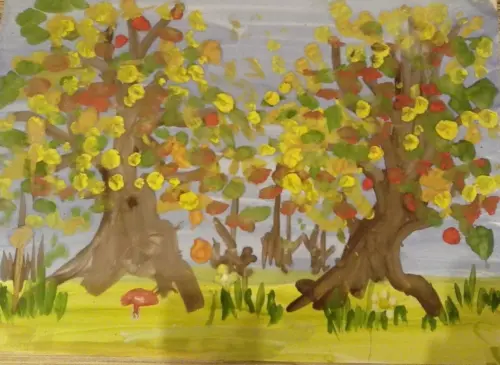 У нас в районе много лесопарков: Чоботовский, Ульяновский, у реки Алешинка. Мы с родителями часто гуляем там. Это мой первый рисунок, я его делал в пальчиковой технике.