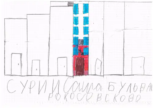 На рисунке изображен любимый бульвар автора, где ему нравится прогуливаться после учебного дня. Саша любит атмосферу города, в которой он чувствует себя максимально комфортно.