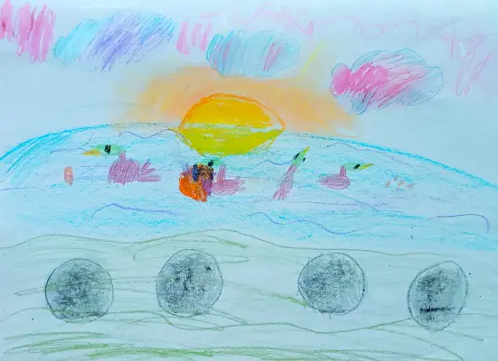 Стефания нарисовала пруд в парке Дружбы, так как живёт рядом с парком и любит там гулять. Отдельное удовольствие ребенку доставляет наблюдать за утками, которые плавают в пруду, с удовольствием подбирают корм, который им приносят. Стефания нарисовала пруд в лучах заката.