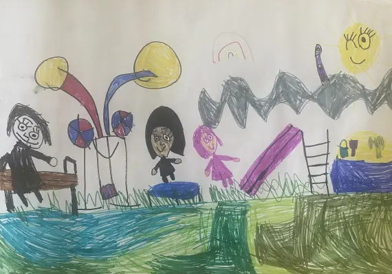 В этом рисунке девочка изображает, как она гуляет на свой площадке с мамой и подружками! На площадке много развлекательных комплексов. Какая прекрасная погода. Девочка прыгает на любимом батуте, а ее подруга катается с горки.