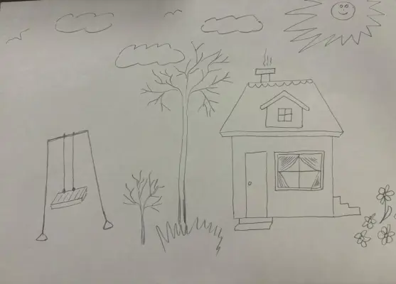 Артем нарисовал свой дом своей бабушки в деревне. Это его любимое место отдыха на каникулах. Рядом качель, которую ему смастерил дедушка когда Артем был еще маленький.